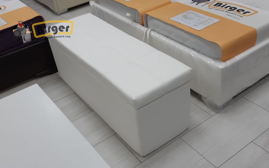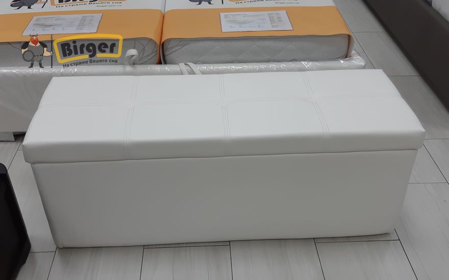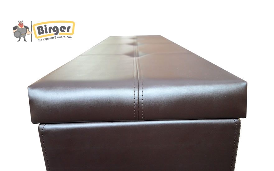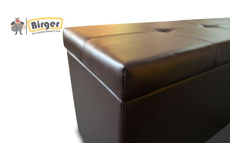 Основа конструкции изготовлена из ДСП, покрыта пенополиуретаном и обшита тканью или кожезаменителем на выбор, дно сундука ламинированное.